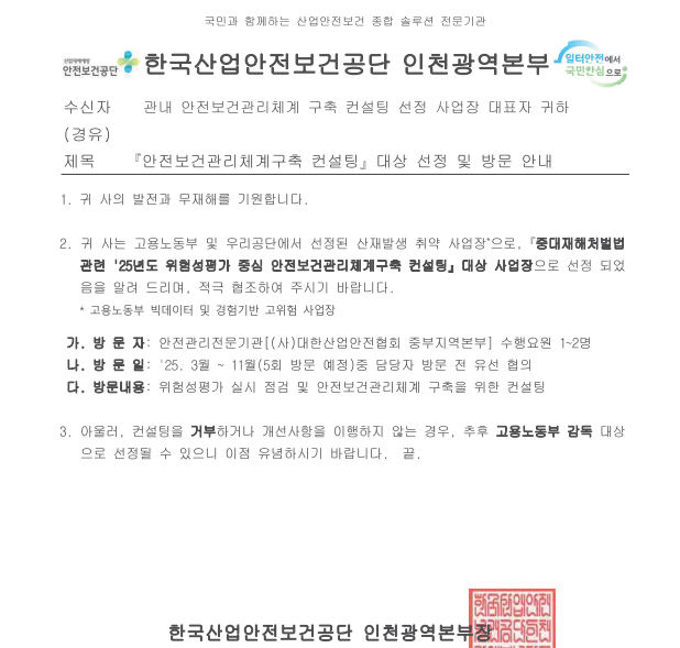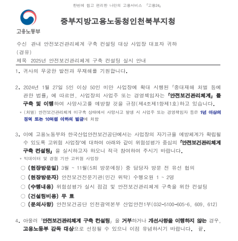 고용노동부로부터 안전보건관리체계 컨설팅 관련 공문을 받으셨나요?